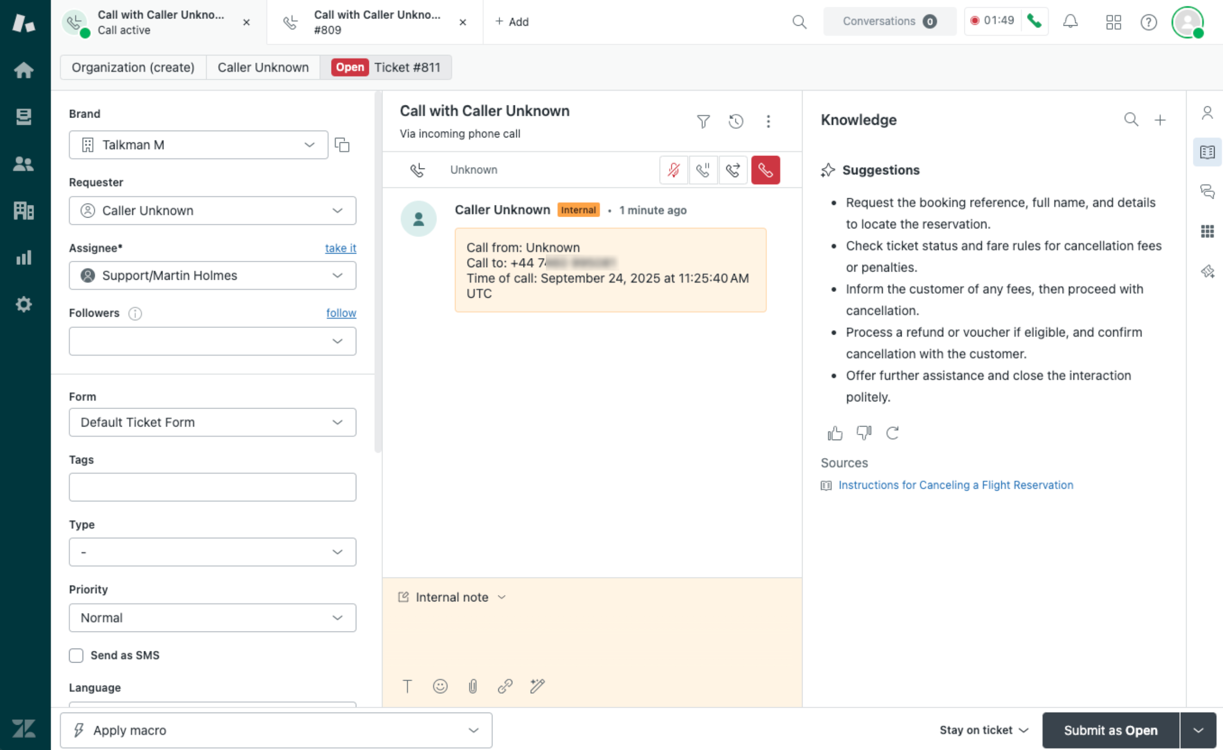 Zendesk's real-time AI suggestions for Voice with Copilot is an innovative feature that provides agents with intelligent, context-aware assistance during active phone calls. The system transcribes conversations from speech to text in real-time, analyses the content, and generates relevant suggestions based on your organisation's help centre articles and knowledge base.